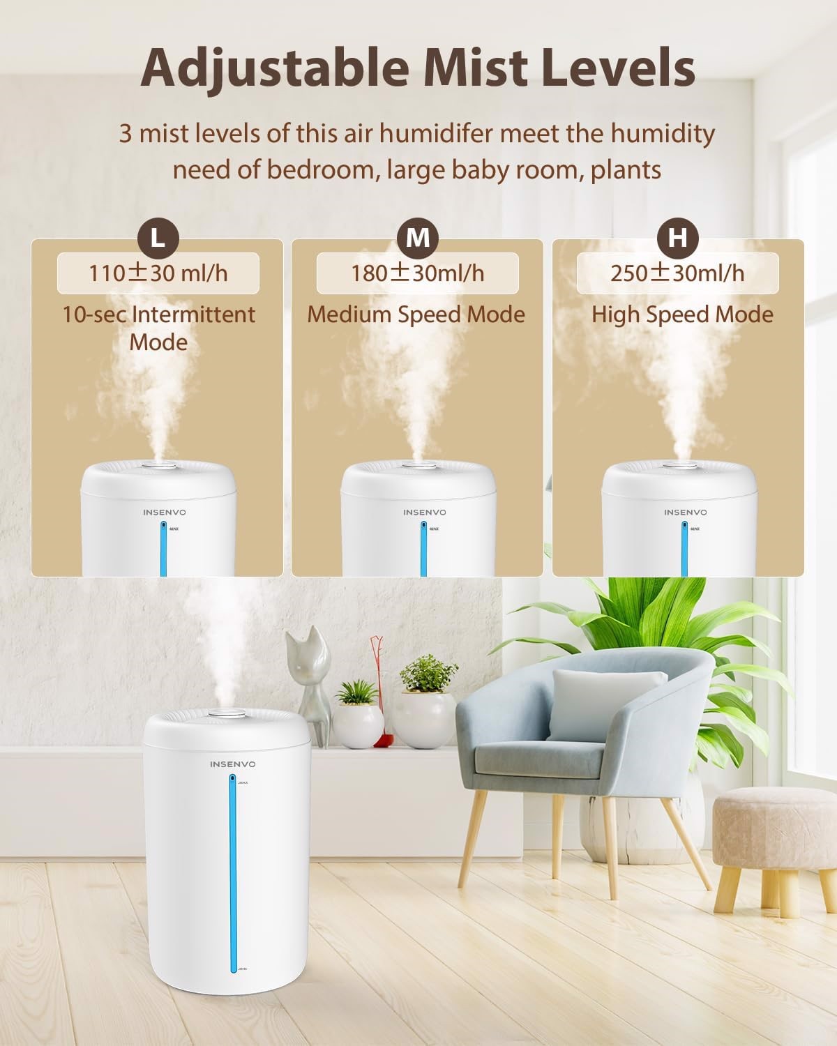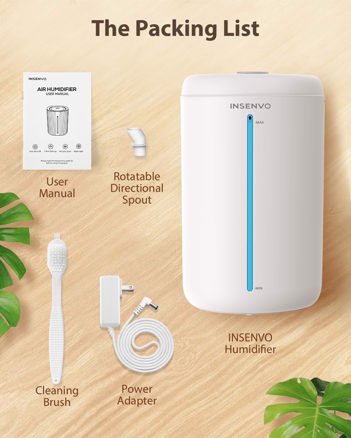 INSENVO Air Humidifier for Plants Baby Nursery, 1.18Gal Cool Mist Top Fill Humidifiers with 3 Mist levels, Auto Shut Off, Night Light, 360° Nozzle, Anti-Spill