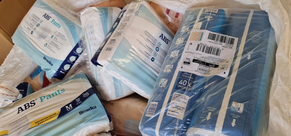 STOCK OF CLEANING ITEMS, DIAPERS, PADS, HAND GEL, HYDRO-ALCOHOLIC GEL, MASKS, DISINFECTANT WIPES, GLOVES, OVERALLS AND GOWNS, WATER BOTTLES, NEW AND SECOND-HAND CLOTHING, SEMI-NEW MATTRESSES, ETC..